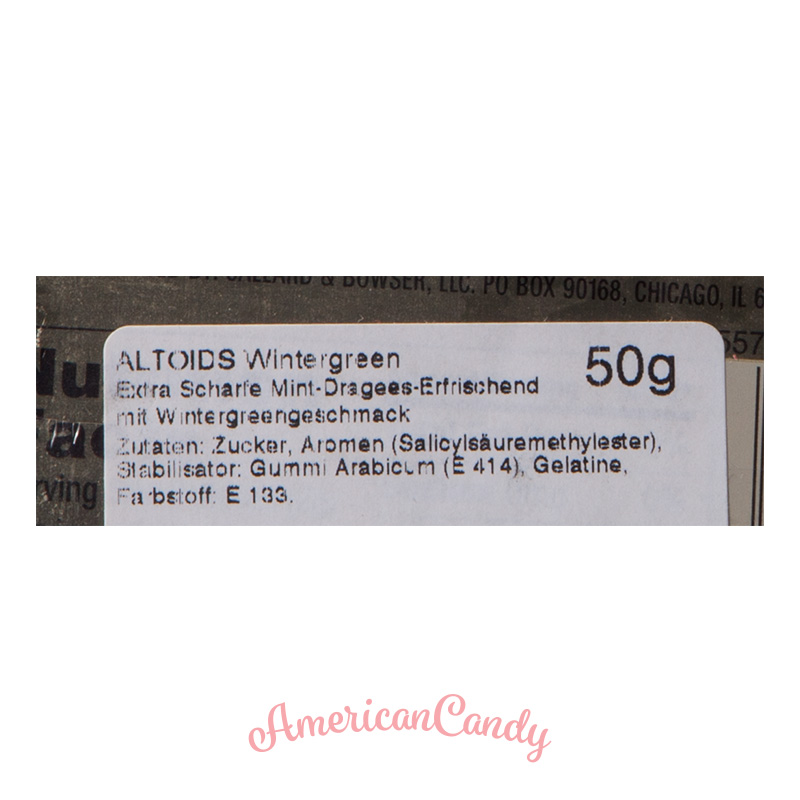 Zucker, natürliche und künstliche Aromen (Salicylsäuremethylester), Stabilisator: Gummi Arabicum (E 414), Gelatine, Farbstoff: E133*. *Kann Aufmerksamkeit und Aktivität bei Kindern beeinträchtigen. Hergestellt mit genetisch veränderten Zutaten.