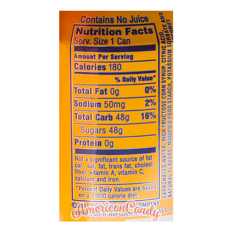 Wasser mit Kohlensäure versetzt, stark fructosehaltiger Maissirup, Antioxidans (E330 Citronensäure), natürliche Aromen, modifizierte Speisestärke, Konservierungsstoffe (E202 Kaliumsorbat, E211 Natriumbenzoat), Säureregulator (E331 Natriumcitrat), Kokosnussöl, Stabilisator (E444 Saccharoseacetatisobutyrat), Farbstoffe (E102* Tartrazin, E110* Gelborange S). * kann Aktivität und Aufmerksamkeiten von Kindern beeinträchtigen