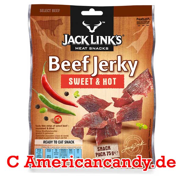 Die einzigartigen Beef Jerkys von JACK LINK'S - 100% reines Rindfleisch aus Brasilien. In einer Tüte sind 60g verpackt. Es handelt sich hierbei um Sweet & Hot Flavor. Diese Beef Jerkys enthalten weniger als 3g Fett und sind sogenannte "Ready-to-eat Snacks" (Ess-Fertig). Ein einzigartiges und leckeres Produkt.