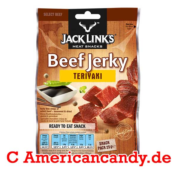 Die einzigartigen Beef Jerkys von JACK LINK'S - 100% reines Rindfleisch aus Brasilien. In einer Tüte sind 25g verpackt. Es handelt sich hierbei um Teriyaki Flavor. Diese Beef Jerkys enthalten weniger als 3g Fett und sind sogenannte "Ready-to-eat Snacks" (Ess-Fertig). Ein einzigartiges und leckeres Produkt, welches es so in Europa fast nirgendwo gibt