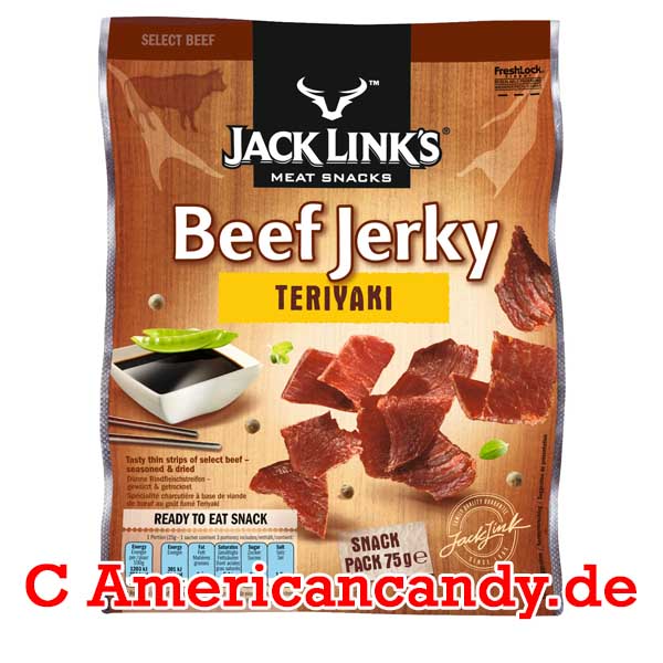 Die einzigartigen Beef Jerkys von JACK LINK'S - 100% reines Rindfleisch aus Brasilien. In einer Tüte sind 60g verpackt. Es handelt sich hierbei um Teriyaki Flavor. Diese Beef Jerkys enthalten weniger als 3g Fett und sind sogenannte "Ready-to-eat Snacks" (Ess-Fertig). Ein einzigartiges und leckeres Produkt, welches es so in Europa fast nirgendwo gibt