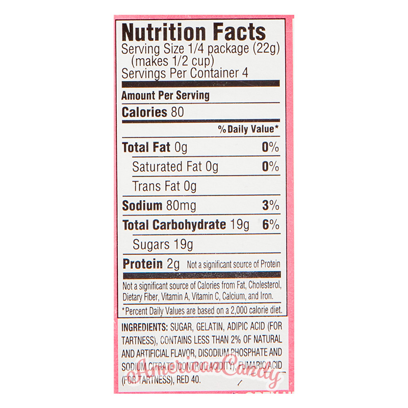 Zucker, Gelatine, Adipinsäure (für Säure), weniger als 2% der nattürliche und künstliche Aromen, Dinatriumphosphat und Natriumcitrat (Control Säure), Fumarsäure (für Säure), Red 40.