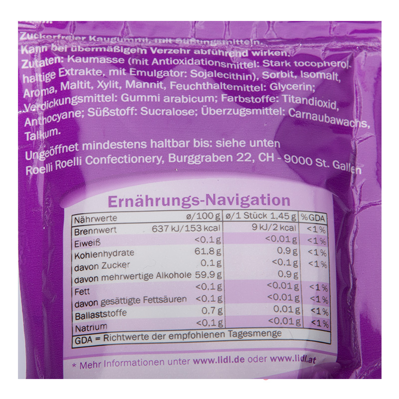Kaumasse (mit Antioxidationsmittel: stark tocopherol haltige extrakte mit Emulgator: Sojalecithin), Sorbit, Isomalt, Aroma, Maltit, Xylit, Mannit, Glycerin, Gummi arabicum, Titandioxid, Anthocyane, Sucralose, Carnaubawachs, Talkum