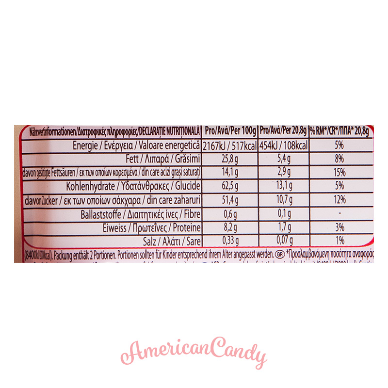 Zucker, MAGERMILCHPULVER, Kakaobutter, WEIZENMEHL, pflanzliche Fette (Palmkern, Palm, Shea, Sal, Illipe, Kokum gurgi, Mangokern), BUTTERREINFETT, MOLKENERZEUGNIS, Kakaomasse, Emulgatoren Lecithine (SOJA), Aromen, VOLLMILCHPULVER, Hefe, Backtriebmittel (Natriumhydrogencarbonat), Salz.