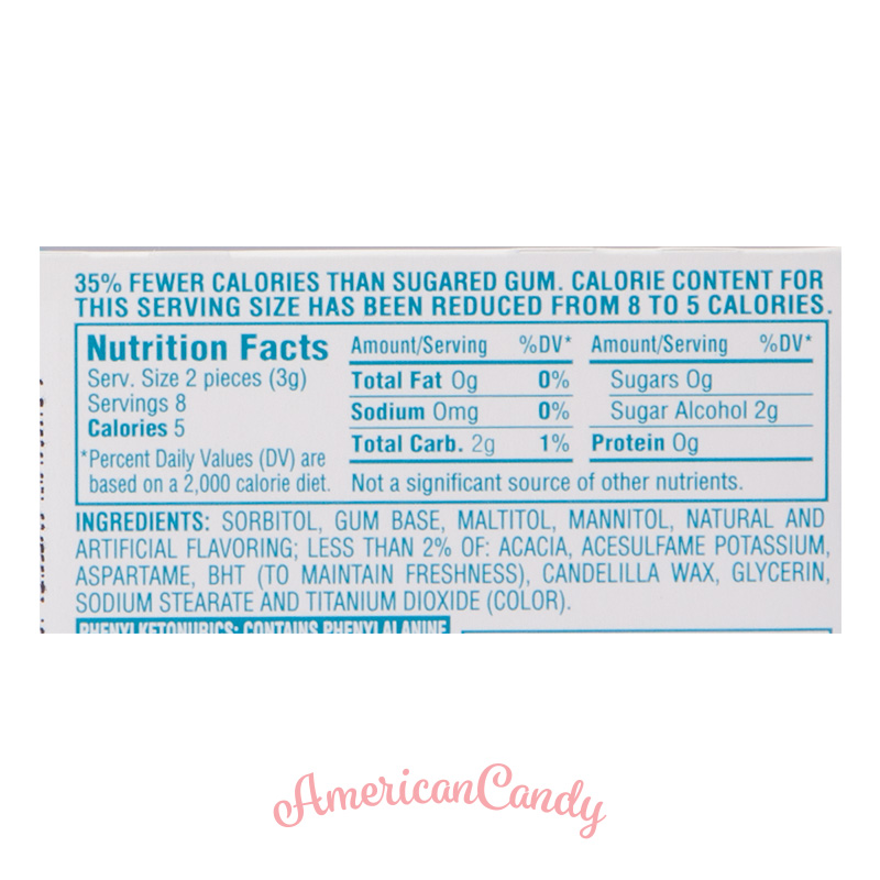 Sorbitol, Gummibasis, Maltitol, Mannitol, natürliche und künstliche Aromastoffe; Weniger als 2% von: Akazie, Acesulfam-Kalium, Aspartam*, BHT (Frischhalten), Candelillawachs, Glycerin, Natriumstearat, Titandioxid (Farbstoff). *Enthält eine Phenylalaninquelle.